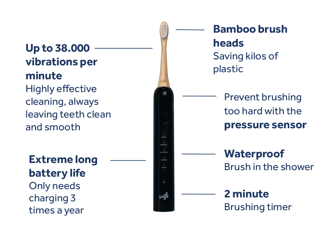 Verbeter je poetsroutine met de Smyle E-Brush. Met 38.000 trillingen per minuut verwijdert hij effectief tandplak en voelt je gebit fris aan. De ingebouwde druksensor beschermt je tandvlees en de timer van 2 minuten zorgt voor een optimale poetstijd. Met een milieuvriendelijke bamboe borstelkop en een energiezuinig ontwerp (slechts 3 oplaadbeurten per jaar) combineert de Smyle E-Brush stijl, duurzaamheid en superieure mondverzorging inéén slank apparaat.